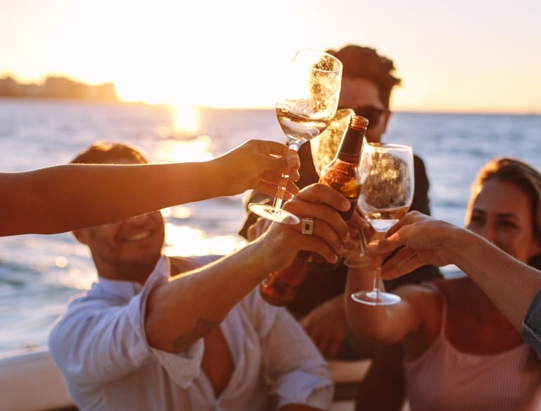 A vibrant aperitivo setup on a boat, with glasses raised against the backdrop of the glowing evening sky.